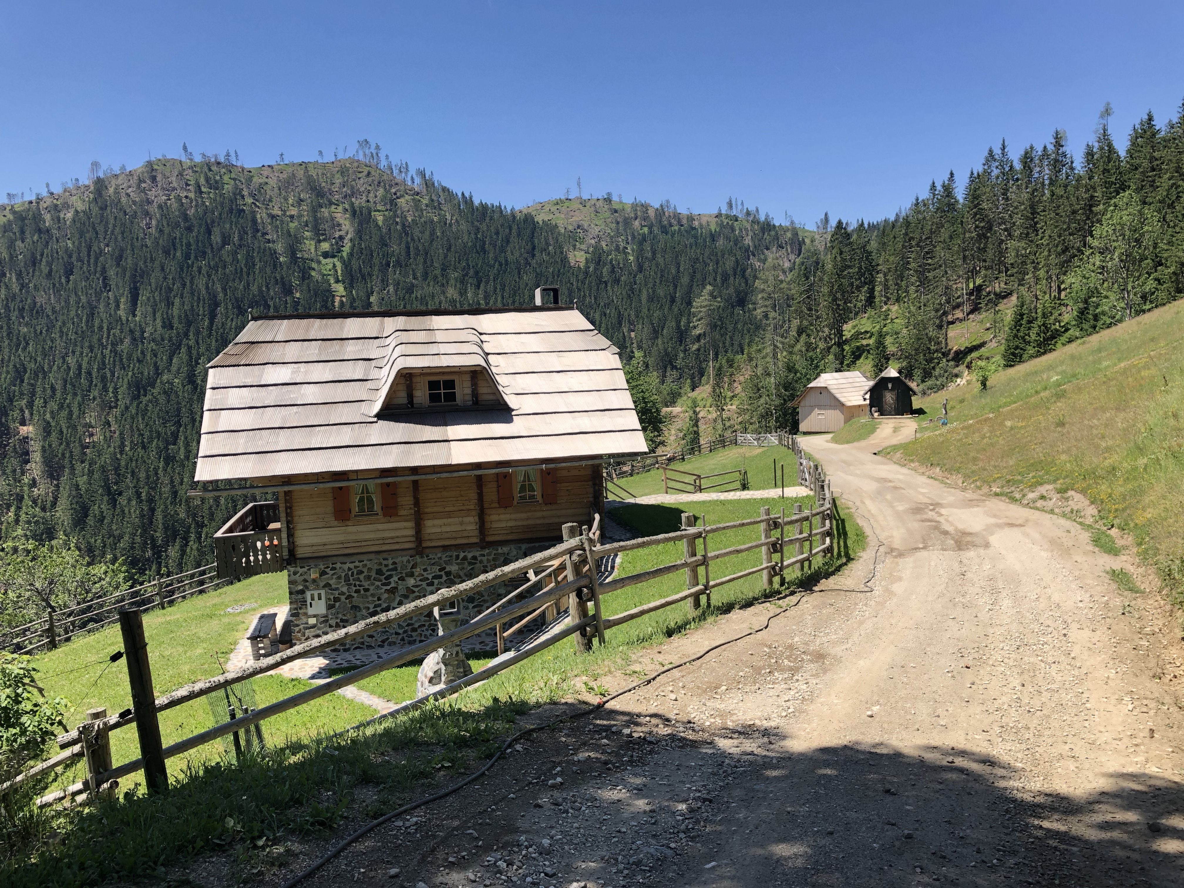Po dolgem spustu proti dolini Koprivne smo se usmerili proti kmetiji Kumer, kjer smo se zopet ustavili. Tokrat smo se ohladili v senci mogočne lipe ob hladni pijači. Ura je med počitkom samodejno zaključila sledenje aktivnosti, ker nisem takoj izbral opcije nadaljuj pozneje. Tako ali tako je bila baterija že na precej nizkem nivoju, zato je bilo bolje to, kot da bi zopet izgubil vse podatke, tako kot nazadnje. Planiral sem, da s seboj vzamem kabel za polnjenje ure, pa sem ga pozabil doma. Zato je potrebno imeti simulacije takšnih dogodkov, saj imaš tako manevrski prostor za napake, ki jih potem ko gre zares ne ponoviš. Sledenje aktivnosti sem nadaljeval s telefonom, za katerega pa sem imel s seboj kabel ter prenosno baterijo. Sonce je bilo visoko na nebu, mi pa smo se odpravili naprej, v smeri Olševe.