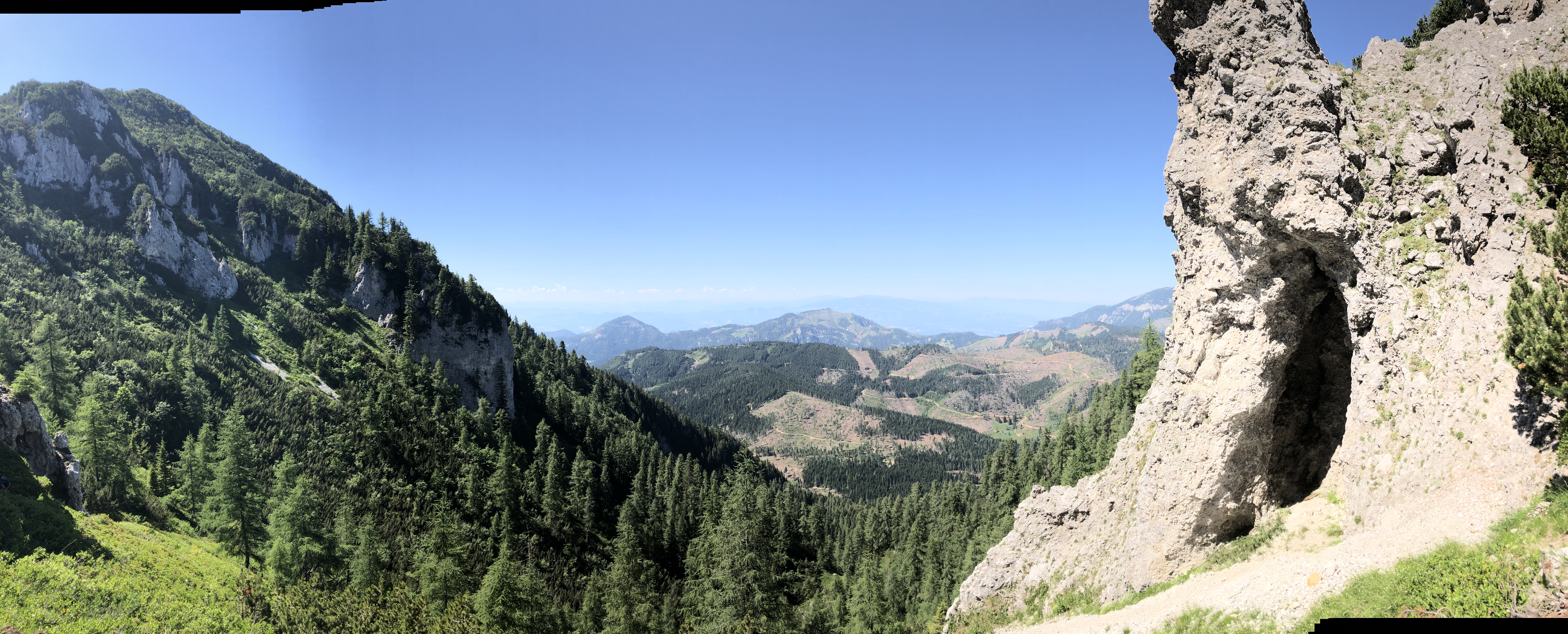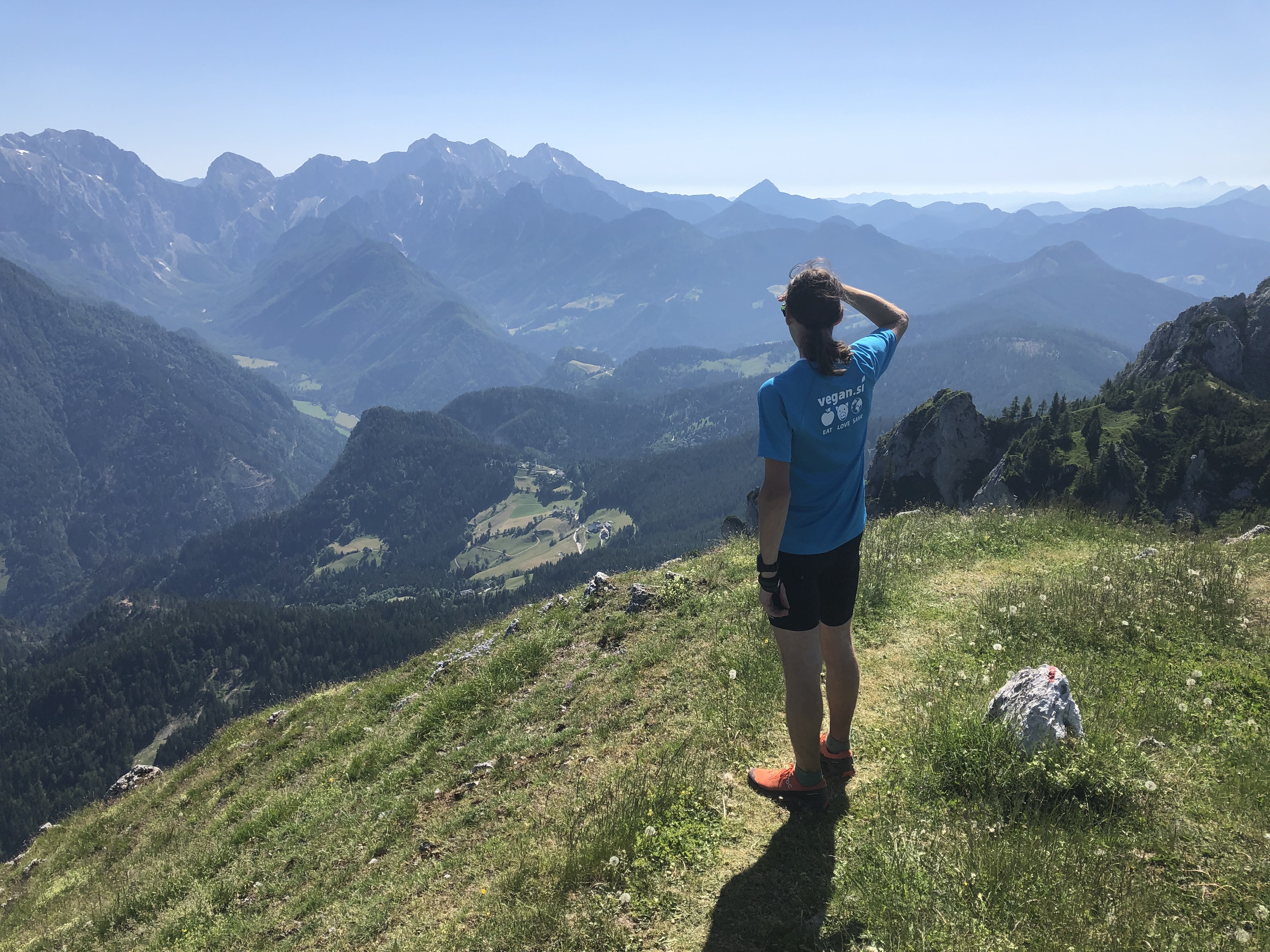 Od tu se odpre res lep razgled na Logarsko dolino obdano z gorami. Res se izplača potrpeti pri vzpenjanju in potem uživati v razgledih. Ker se je dan že pošteno prevesil v popoldne, smo se dogovorili, da Raduho preskočimo, ter se takoj namenimo nazaj proti Črni. Najprej smo po pobočju prečili Gladki vrh ter Odenični hriber, potem pa spust do Bukovnika pretekli, kar je bilo precej zabavno! Na križišču smo srečali družino, ki se je ravno pakirala v avto. Svetovali so nam, da se vrnemo nekaj 100m po nazaj, ter po gozdni poti uberemo bližnjico v dolino. Ko smo prispeli na asfalt, smo med tekom ugibali, kako daleč je še do Črne. Samo je predlagal, da štopamo kakšen avtomobil, jaz pa sem zamahnil z roko, češ da je samo še 4-5 km, te pol ure bomo pa ja še potrpeli. Čez nekaj minut pa se je eden izmed avtomobilov sam ustavil, ter nam ponudil prevoz. Bil je gorski reševalec, ki se je vračal iz dežuranja na koči pod Raduho. Seveda nismo odklonili, sploh ko nam je povedal, da je do Črne še 8 km! Tako smo si prihranili debelo uro nabijanja utrujenih nog po asfaltu. Takšno izkušnjo si raje prihranimo za avgusta!