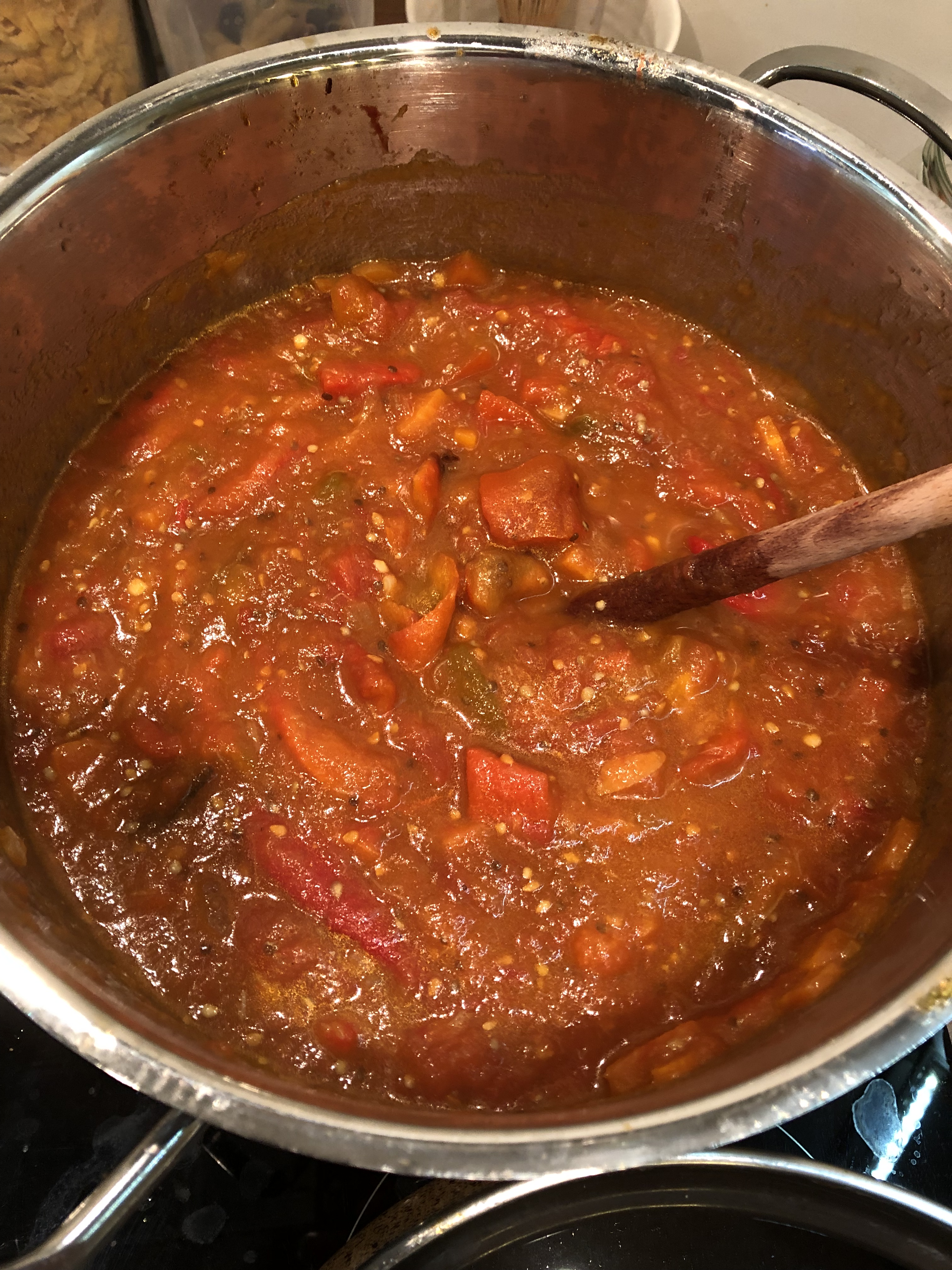 Medtem se paradižnik dobro razkuha. Dodamo mu omako iz jajčevcev, pečeno papriko, kis, sol in sladkor. Še vedno mešamo in vmes pokušamo, če je potrebno še soliti. Po 10-15 minutah je lutenica pripravljena za v kozarce.