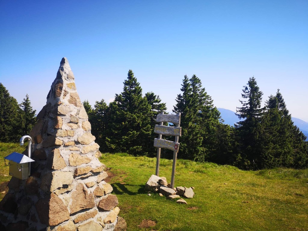 Na vrhu postanek za sliko, ter že sva se spuščala po državni meji v Koprivno proti kmetiji Kumer. Po dobri uri jo doseževa, zopet poiščeva kje si lahko natočiva vodo, a tokrat brez sreče. Odpraviva se naprej proti zadnjim travnikom in na poti pri vikendu ob cesti naletiva na pipo z vodo, kjer sva obnovila zaloge.