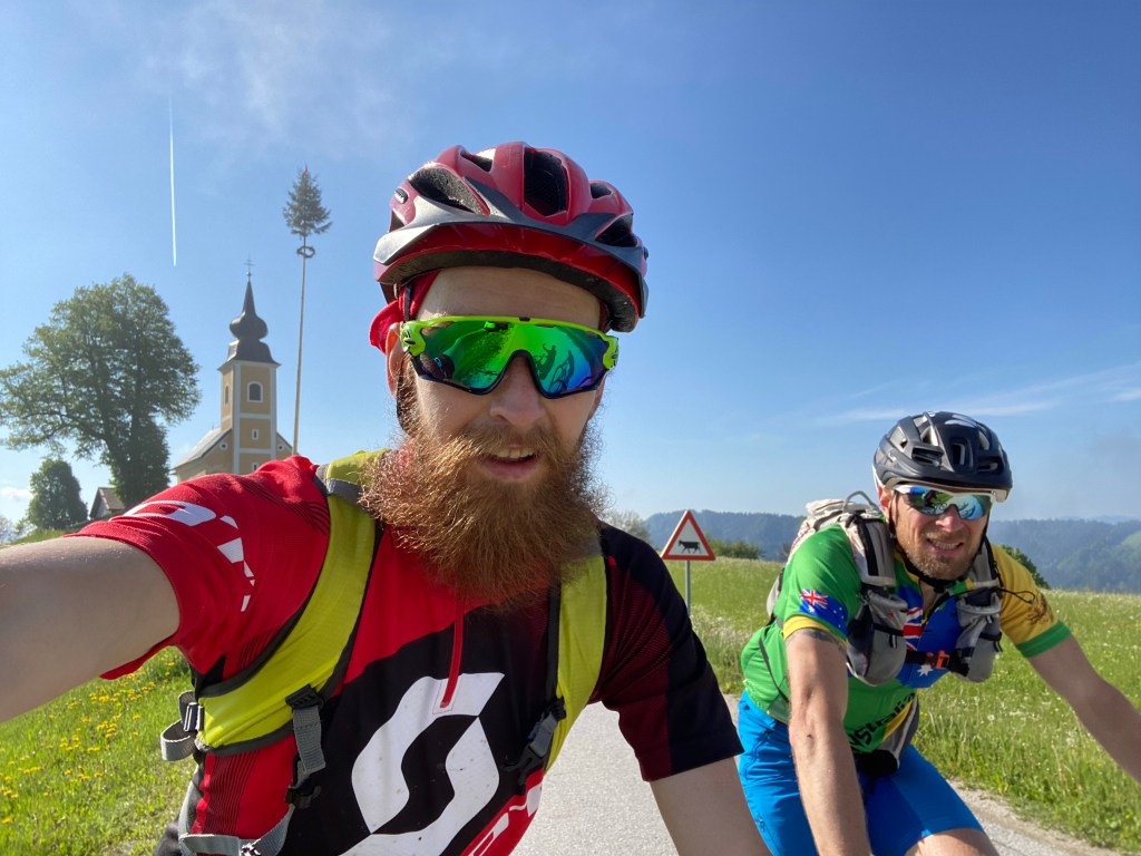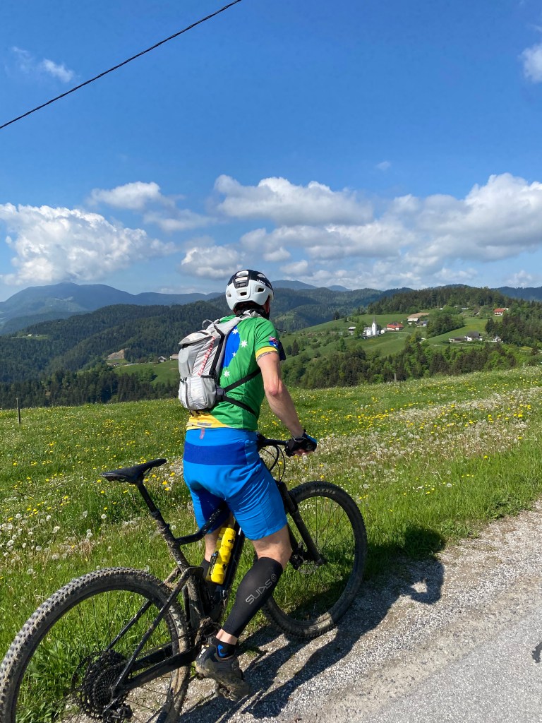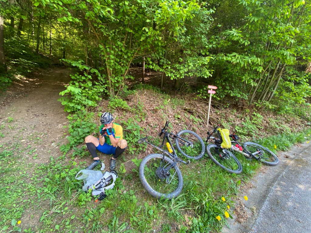 Po delu poti sva se strinjala, da se poskušava čimbolj približati originalni trasi, tudi če bo treba na določenih delih kolo nositi. Tako je spremenjen segment poti čez Tisnik, ki sva ga opravila iz Hude luknje po vzpenjajoči se cesti v smeri Cirkovc in nato po stezi prečkala pobočje Tisnika proti Završam. Od sv. Vida je ves čas asfaltna cesta vse do spusta v Ponikvo. V dolini sva konkretno zabredla s kolesi v sveže naplavljeno mešanico mivke in blata. Zabavno. Vzpon do Graške gore in spet sva na asfaltu, a ne za dolgo. V smeri Razborja je mešanica stezic in gozdnih cest, ki jih z užitkom odvrtiva.