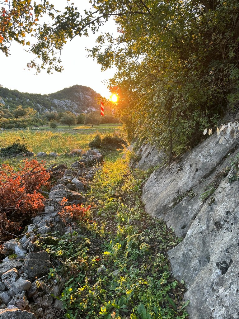 Tečemo skozi stara zapuščena naselja po dolini, ki sedaj izgledajo kot muzej na prostem. Za tem se vzpenjamo iz ceste na vrh prevala. Ob poti zagledam čudovit šopek Timijana. Vse polno ga je. Odtrgam si par vejic, jih zavijem v ovratno ruto in pospravim. Šlo bo v mešanico za domači čaj. Ko se pot zopet prevesi navzdol, se odpre dolina na koncu katere je ravna cesta, na koncu ceste pa se ponuja pogled na morje. In v daljavi vidim nekoga, ki teče. Točno tja gremo!